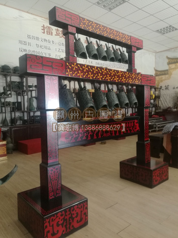 12件演奏型編鐘支架采用漆木工藝制作,古樸典雅,鐘音優(yōu)美準(zhǔn)確。